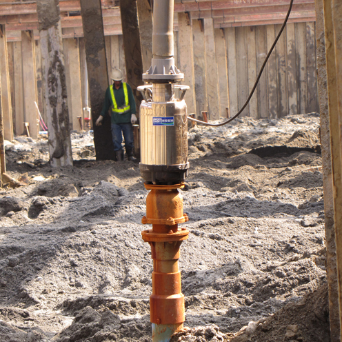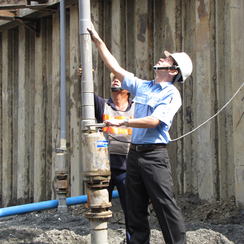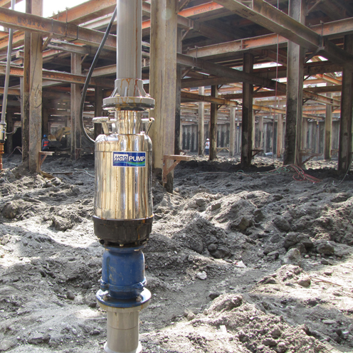 The project is a third branch of a renowned shopping mall in downtown area of a southern metropolitan. The shopping mall is scheduled to open in Q4 of 2012; it occupies 50,000 square meters of land, the finished floor area for business will be around 20,000 square meters in a 5-story building. It is expected to create more than 1,000 employment opportunities for the locality, which could substantially boom up the entire commercial district. The foundation excavation is below the groundwater level. In order to stabilize the excavation face as well as to keep the surface dry for carrying out construction works, the groundwater level has to be drawn down to below the excavation face. The project involves installation of several rows of small diameter point-wells, with vertical piping and collector headers provided on top of all the point-wells; IC type pumps are used for pumping out the groundwater, so as to lower the groundwater level. The duration of groundwater control in the foundation excavation is a key factor that affects the subsequent progress of the construction. HCP' s IC Type Amphibious Pump Series complies with the 24-hour operation requirement. The chromium steel impeller is suitable for the sandy water environment for a largely prolonged service span, effectively saving subsequent maintenance costs of the pump. The IC Series pumps are driven by fully water-cooled motors which allow long-duration operation. The motors have a high efficiency for power saving. The pump assembly has a protection class of IP68 against water ingression. The state-of-the-art impeller design of the IC Series provides high-head and high flow rate performance as well as an excellent suction capability, which is suitable for well-pipe applications. This pump can also be used for both suction and pushing of water. By removing the filter screen, the pump can be used as a land pump by connecting it to a groundwater tank.